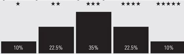 Morningstar foretager månedligt en rating af puljerne ved tildeling af op til fem stjerner efter fordeling af puljerne i den enkelte gruppe som vist på figuren nedenfor.