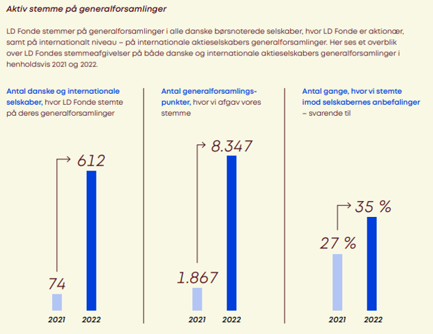 I 2022 tog vi på generalforsamlingerne stilling til i alt 8.347 beslutningspunkter og stemte imod anbefalingerne fra ledelsen i 35 % af tilfældene. At der så ofte stemmes imod ledelserne skyldes, at vi fokuserer på selskaber med lav bæredygtighedsindsats og selskaber, hvor ledelsen ser anderledes på selskabets aktiviteter, end vi gør. Vi har fx fokus på selskabernes planer for reduktion af drivhusgasser og ser på, om der er opstillet realistiske mål for reduktion af udledningen, og om der rapporteres åbent og troværdigt om klimapåvirkningen.