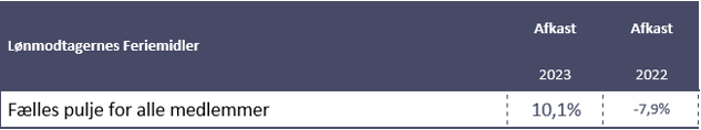 665.000 medlemmer med en samlet formue på 21,3 mia. kr. har fået øget værdien af de opsparede feriemidler med 10,1 % i 2023 efter fradrag for omkostninger og pensionsafkastskat. Det er et højt afkast, både absolut og set i lyset af den moderate investeringsrisiko. I modsætning til mange sammenlignelige fonde har medlemmerne nu et positivt afkast for de seneste 2 år samlet set. Det negative afkast i 2022 er mere end opvejet af afkastet i 2023.