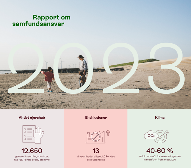 Du kan læse mere om LD Fondes indsats som aktive ejere og vores arbejde med ansvarlige investeringer i "Rapport om samfundsansvar 2023".
