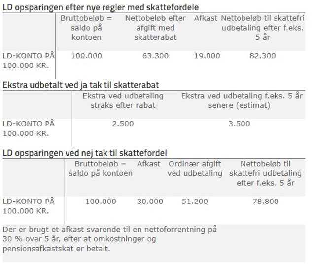 Skatterabatten betyder, at du i sidste ende får mere udbetalt. Det er en økonomisk fordel for de fleste. Men hvis du gerne vil bevare muligheden for at flytte din LD-opsparing til en rate- eller en livrentepension hos et andet pensionsselskab eller pengeinstitut, skal du sige nej tak til skatterabatten.