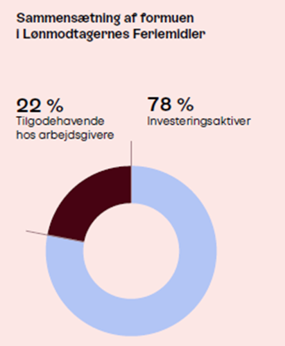 Formuen i Lønmodtagernes Feriemidler består af en investeringsportefølje med finansielle aktiver samt et tilgodehavende hos arbejdsgivere i form af endnu ikke indbetalte feriemidler. Afkastet på investeringsaktiverne afhænger af udviklingen på de finansielle markeder, mens arbejdsgivertilgodehavendet reguleres med en lønstigningstakst. Dit samlede afkast opgøres som en vægtet sum af de to dele.