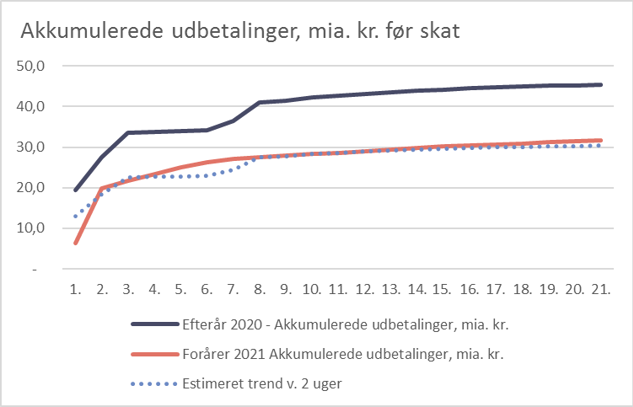 Figurerne nedenfor viser udbetalingerne i foråret 2021 sammenlignet med udbetalingerne i efteråret 2020.