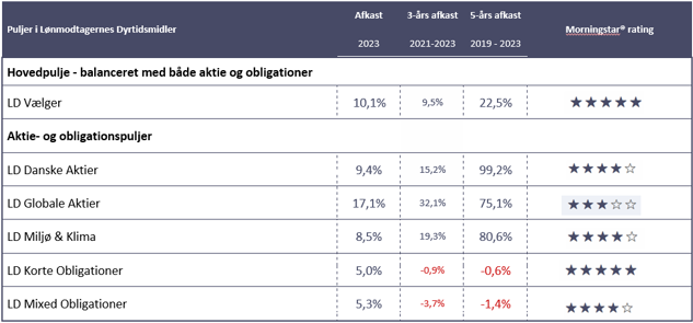 Det højeste afkast er opnået i LD Fondes globale aktiepulje, som bl.a. høstede store gevinster på det amerikanske aktiemarked. For både den danske og den globale aktiepulje var den positive udvikling i vid udstrækning trukket af en mindre gruppe selskaber, som leverede meget høje afkast. Puljen LD Miljø & Klima gav et lavere afkast end den globale aktiepulje. Det skyldes bl.a. modvind til selskaber, der producerer vedvarende energi, og at porteføljen ikke er eksponeret mod de globale teknologiselskaber, der steg kraftigt i værdi i 2023.