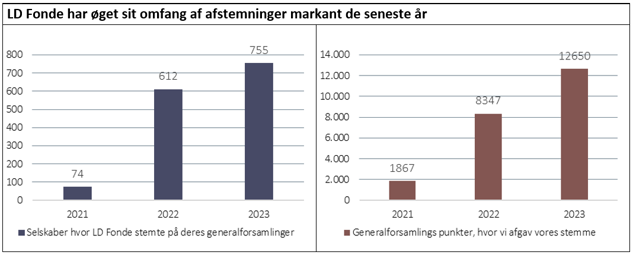 LD Fonde gør i sin netop offentliggjorte ”Rapport om samfundsansvar 2023” status for arbejdet med ansvarlige investeringer. Rapporten viser bl.a., at LD Fonde i 2023 brugte sin stemmeret som aktionær 12.650 gange ved generalforsamlinger i 755 virksomheder fra alle verdensdele. Det var ca. 4.300 gange flere end året før og knap 10.800 gange flere end i 2021.